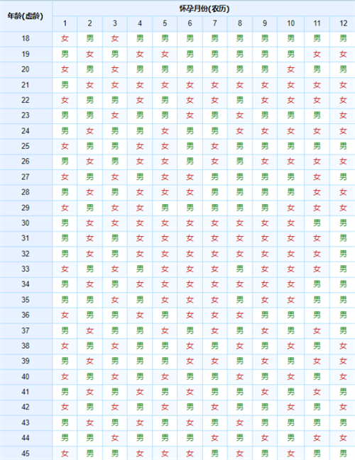 例如:你今年26周岁,怀孕为农历4月。那么你应该找竖列27(26+1=27),横列4,然后会看到交叉处显示的是男。那么预示着你生男宝的几率会非常大。